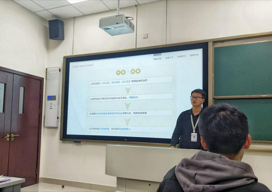 杨斌主要从电信诈骗的界定、电信诈骗的常见形式、如何防范电信诈骗以及被诈骗之后的补救措施这四个方面展开讲解。为同学们介绍了校园里常见的诸如冒充熟人诈骗、网络刷单诈骗、兼职诈骗、以学习及培训等事件为由向员工或者家长行骗等不法分子惯用的伎俩和手段。同时,他结合多个发生在员工身上的真实案例,提醒同学们:骗局就潜伏在你我身边,在日常生活中不要贪图小便宜;一旦遇到电信网络诈骗,要时刻保持理智的头脑,不熟悉的问题及时求助辅导员;已经造成损失的要及时向公安机关报案。同时告诫所有同学树立正确的价值观和消费观,抵制诱惑,将精力更放在学习上,充分利用大学时光提高自己的能力和素质。